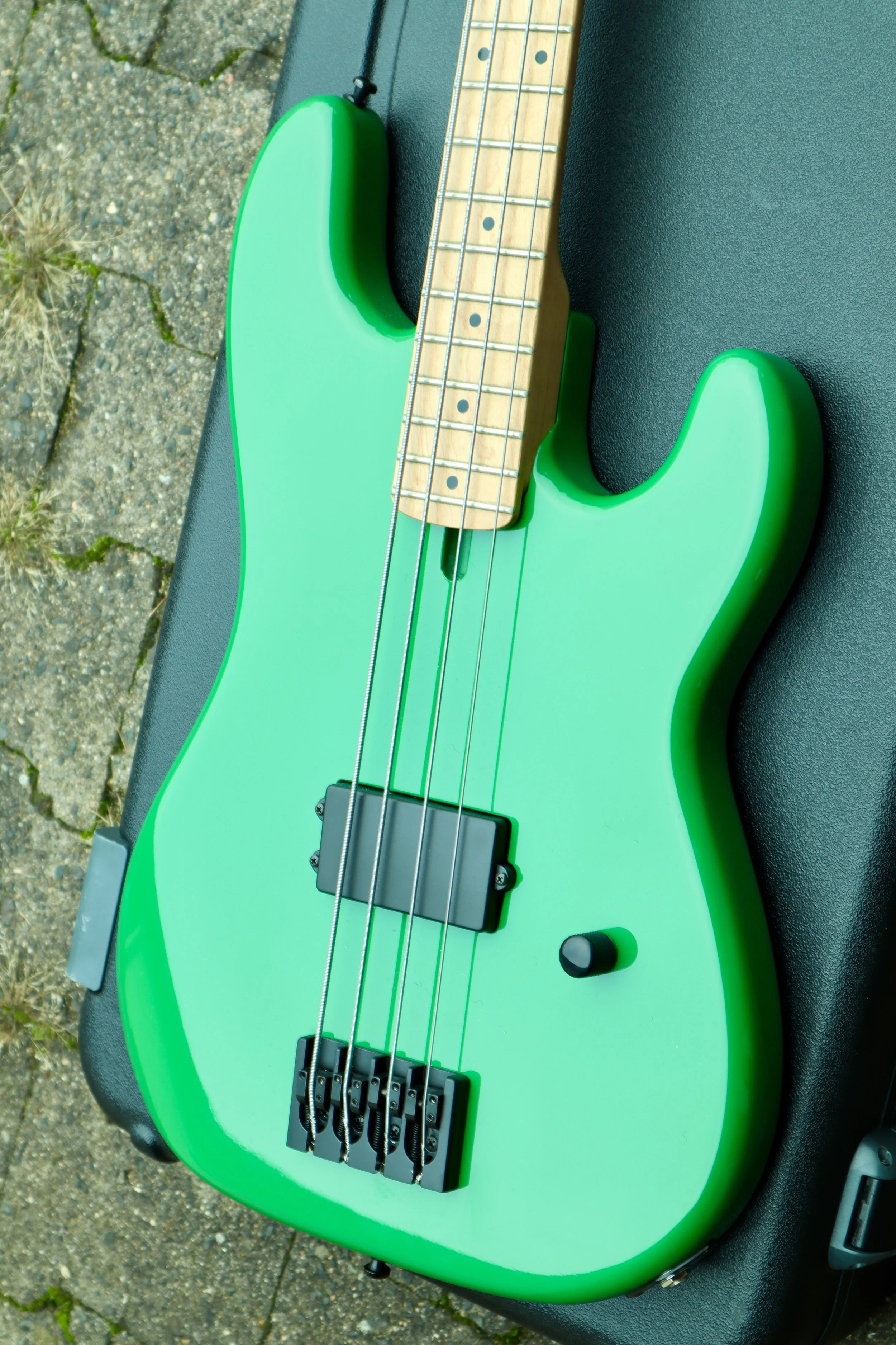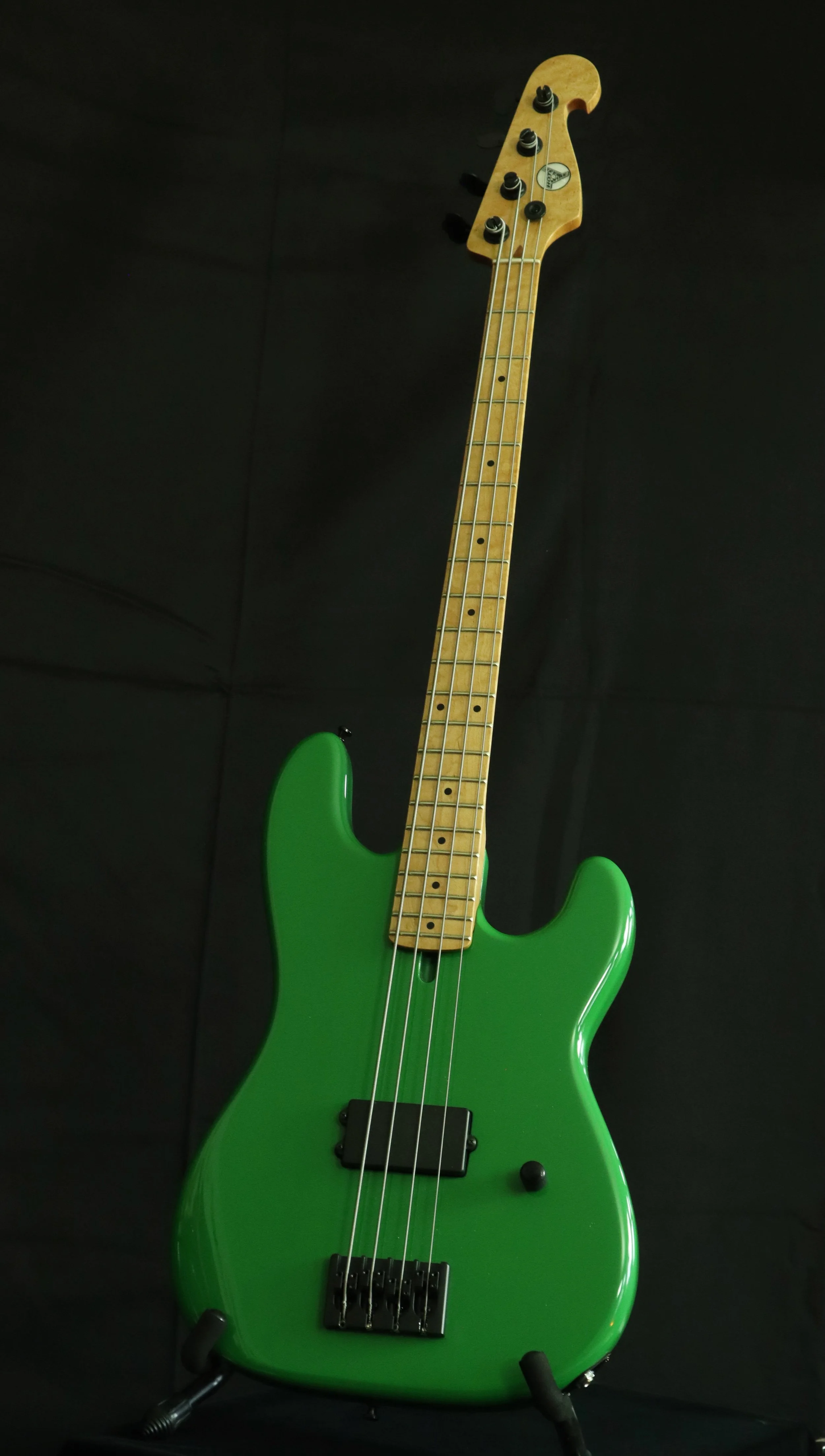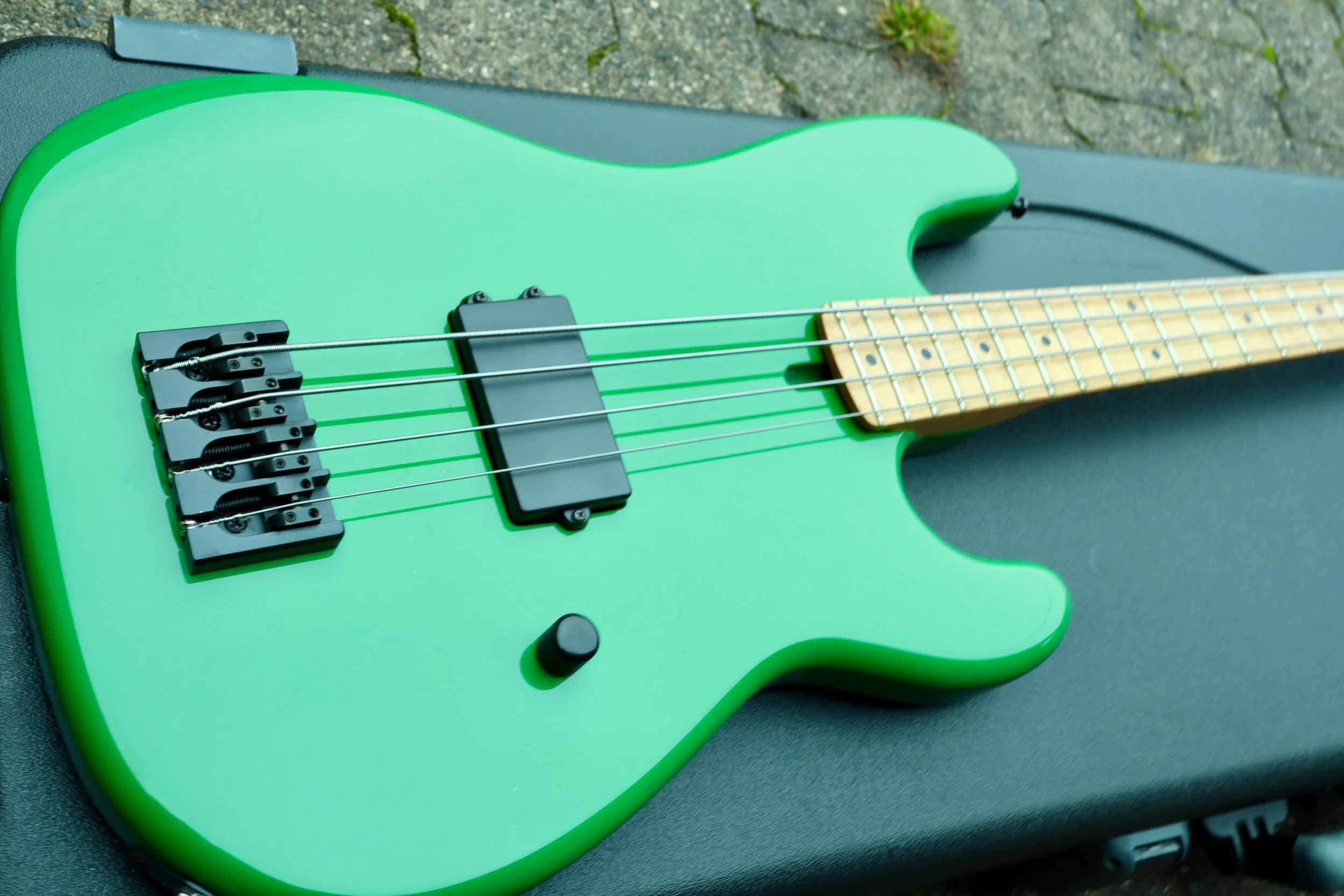 "Charging Green" was the colour of choice here, and nothing more than an MM pickup was requested, mounted in a precisely calculated position on the alder Prezz body with one passive volume control No fancy bells and whistles here. Less is more! Add a fine figured maple neck, black Hipshot tuners, and you're done! Strap it on and have some good clean fun!